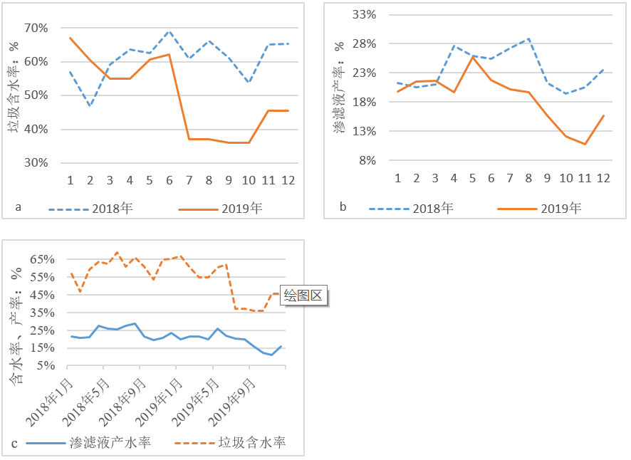 圖9 2018年-2019年生活垃圾分類前后垃圾含水率、滲濾液產(chǎn)率及兩者變化趨勢