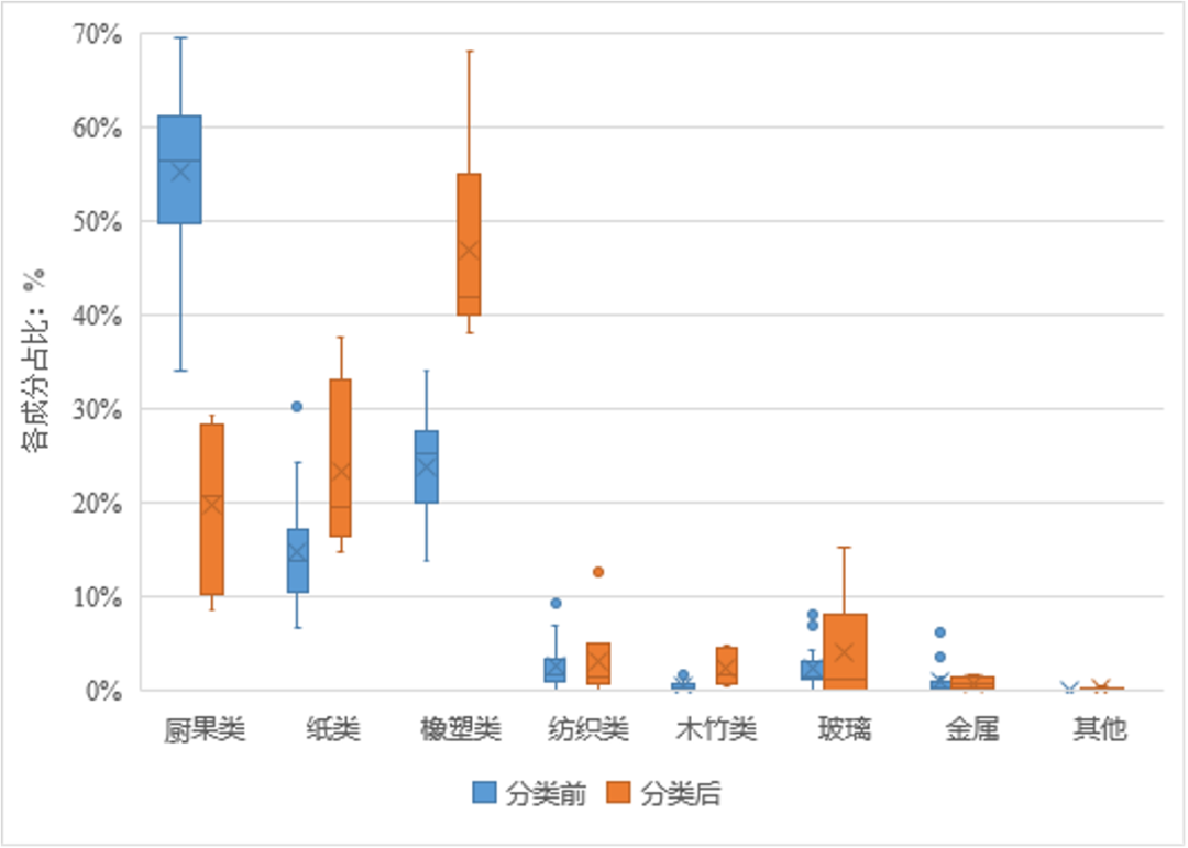 分類前,進(jìn)入焚燒廠的垃圾成分中廚果類占比55.24%,橡塑類占比23.82%,紙類占比14.71%,紡織類、玻璃類、金屬類、木竹類、磚瓦陶瓷類等合計(jì)占比6.23%。垃圾分類后,進(jìn)入焚燒廠的生活垃圾廚果類占比19.63%,橡塑類占比46.81%,紙類占比23.24%,紡織類、玻璃類、金屬類、木竹類、磚瓦陶瓷類等合計(jì)占比10.32%。