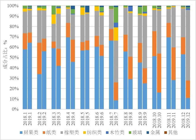 圖6 2018年至2019年生活垃圾分類前后各成分占比月度堆積圖
