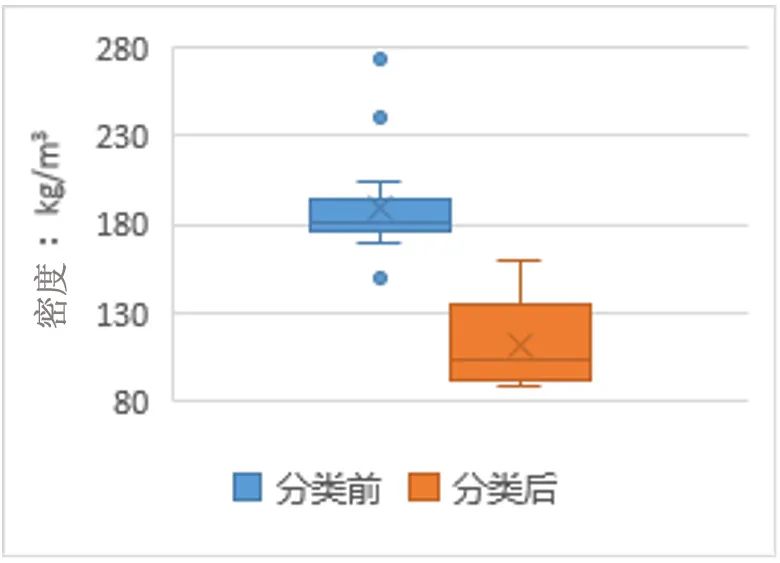 生活垃圾分類前后密度分布對比見圖2。分類前,進(jìn)入焚燒廠的生活垃圾密度在150-274 kg/m3之間變化,均值為187 kg/m3。分類后,進(jìn)入焚燒廠的生活垃圾密度在89.6-160 kg/m3之間變化,均值為112.75 kg/m3。