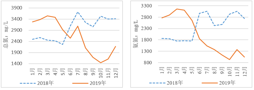 圖11 2018、2019年生活垃圾分類前后滲瀝液水質(zhì)中氨氮、有機(jī)氮變化趨勢