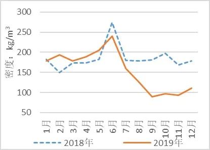 生活垃圾中的廚果類與橡塑類密度相近,與之相比紙類密度較低;垃圾分類導(dǎo)致廚果類與橡塑類合計(jì)占比下降12.62%,紙類占比上升8.53%,進(jìn)而影響垃圾密度降低。垃圾密度在2019年1-6月(分類前)與2018年同期(分類前)相比上升4%,7-12月(分類后)同期相比下降38%,由此推算分類后的垃圾密度與分類前同期相比下降42%,見圖8。