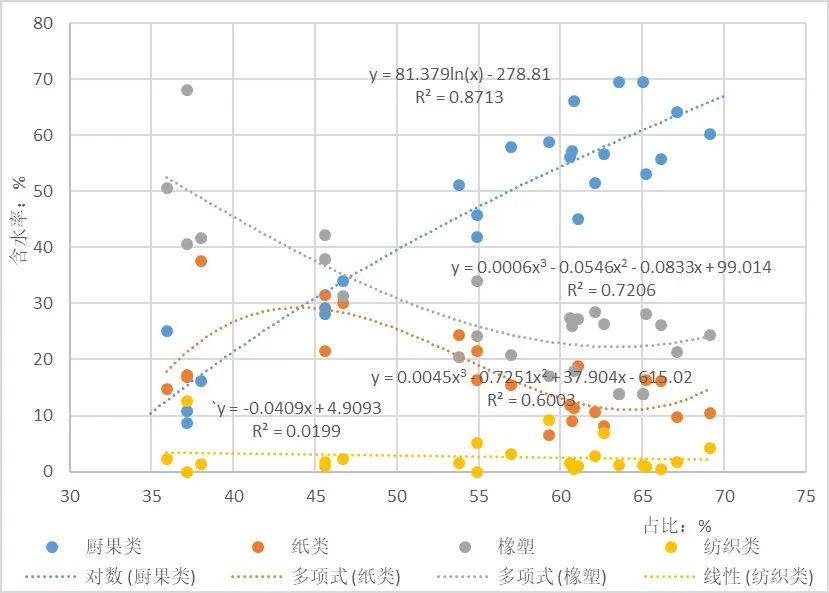 垃圾組分中,廚果類、紙類、橡塑類及紡織類垃圾對含水率影響較大[6]。選取2018年1月-2019年12月生活垃圾各組分占比變化與含水率數(shù)據(jù)耦合分析,廚果類占比與含水率呈正相關(guān)關(guān)系;橡塑類、紡織類占比與含水率呈負(fù)相關(guān)關(guān)系;而紙類占比與垃圾水率關(guān)系呈波動(dòng)關(guān)系,即為在占比低于45%及高于65%時(shí)與含水率成正相關(guān)關(guān)系,占比在45%-65%與含水率成負(fù)相關(guān)關(guān)系,垃圾主要成分對垃圾含水率影響趨勢見圖14。