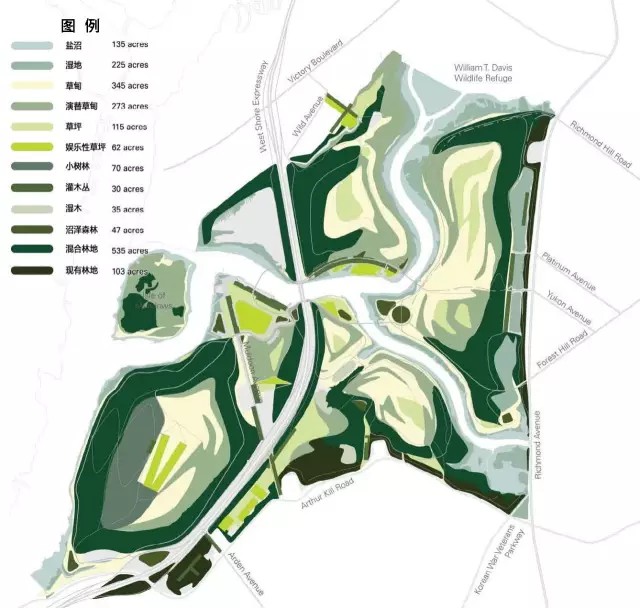 在1948年垃圾填埋場運營之前,弗萊士河區(qū)域是哈德遜河河口最大的濕地之一,50多年的垃圾填埋對生態(tài)造成了嚴重的影響。公園總體規(guī)劃旨在恢復(fù)基地原有的生態(tài)風(fēng)貌與動植物棲息地,并設(shè)立了五個主要目標(biāo):