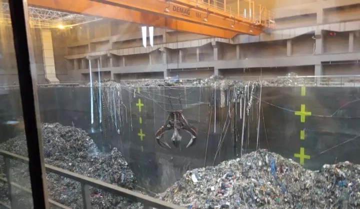 首先,生活垃圾運(yùn)輸車(chē)經(jīng)地磅稱(chēng)重后,由上料坡道進(jìn)入卸料大廳。在垃圾吊控制室的統(tǒng)一指揮下,運(yùn)輸車(chē)將垃圾由指定卸料門(mén)卸入垃圾池內(nèi)。垃圾池采用全封閉性設(shè)計(jì),氣壓為負(fù)33pa,有效防止了臭氣外逸。垃圾池上方有四臺(tái)垃圾吊抓斗(三用一備),每臺(tái)容積為12立方米,是目前國(guó)內(nèi)最大的單體抓斗,采用手動(dòng)+半自動(dòng)式操作將抓取的垃圾從池內(nèi)送入進(jìn)料口,進(jìn)入焚燒爐焚燒。