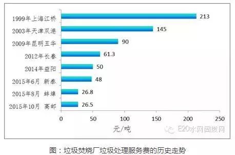 隨著中國城市化的加速,城市人口大幅增加,城市垃圾量也急劇增多,當(dāng)前,城市生活垃圾累積堆存量已達(dá)70億噸,而全國垃圾年產(chǎn)量仍以每年8%-10%的速度增長,與GDP增速匹敵,預(yù)計截止到2020年,城市垃圾產(chǎn)量將達(dá)約3.23億噸。垃圾焚燒發(fā)電是解決“垃圾圍城”的重要方式之一。由于在實施垃圾焚燒發(fā)電項目前期投資金額大,故一般采取PPP/BOT方式進(jìn)行,項目投資回收主要依靠上網(wǎng)發(fā)電收入及垃圾處理服務(wù)費補(bǔ)貼收入。近16年來,垃圾處理的政府補(bǔ)貼費用呈現(xiàn)大幅下跌狀態(tài)(如下圖)。
