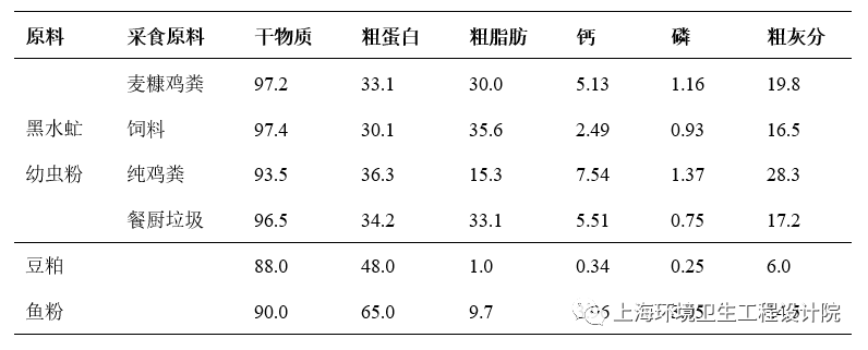 研究表明,黑水虻幼蟲的營養(yǎng)價值較高,營養(yǎng)組成具有一定的可塑性。分析表1數(shù)據(jù)可知,其體內(nèi)特定營養(yǎng)組分的含量高低可通過調(diào)節(jié)其采食的有機廢棄物的營養(yǎng)來實現(xiàn)。黑水虻烘干蟲粉中粗脂肪、鈣和灰分的含量受到采食底物的影響較大,而蛋白質(zhì)和氨基酸組成則相對比較穩(wěn)定。雖然幼蟲的氨基酸總含量低于黃粉蟲、蠅蛆、桑蠶蛹的氨基酸含量,但氨基酸如賴氨酸、蛋氨酸、亮氨酸、纈氨酸和酪氨酸含量較高,可通過優(yōu)化飼料配方增加飼料氨基酸含量,并不影響作為動物飼料蛋白的品質(zhì)。表1 采食不同底物黑水虻與豆粕和魚粉的營養(yǎng)成分含量(%)比較