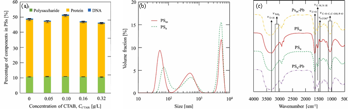 圖4 高分子物質(zhì)的特性分析。(a)多糖、蛋白質(zhì)和DNA的質(zhì)量百分比;(b)PSus和PSu的典型粒度分布;(c)各PSs的FTIR(來自原文)