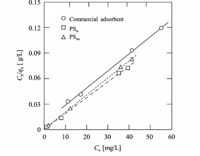 圖7 PSu、PSus和商用吸附劑對Pb2+的Langmuir吸附等溫線(吸附劑的濃度為60 mg·L-1,Pb2+的初始濃度為0.1~0.6 mmol·L-1,實驗溫度為25℃)(來自原文)