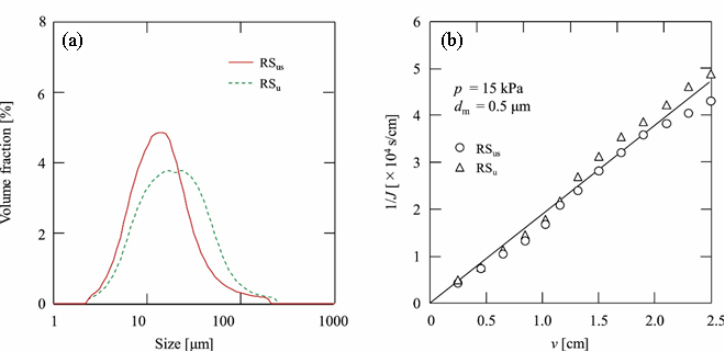 圖8 RSus和RSu的特性。(a)粒度分布;(b)過濾行為(橫軸v表示單位面積上濾過的濾液體積,縱軸1/J表示過濾速率的倒數(shù))(來自原文)