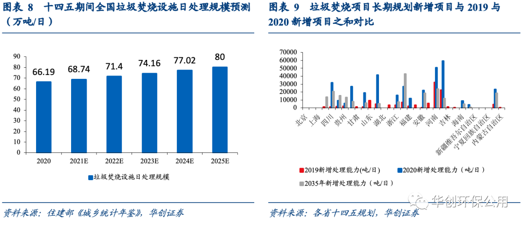 十四五政策明確2025年焚燒產(chǎn)能需達80萬噸/日(十三五為58萬噸),2020至2025年行業(yè)將保持4%的復(fù)合增速。我們對根據(jù)各省生活垃圾焚燒發(fā)電中長期專項規(guī)劃做了對比與分析后發(fā)現(xiàn),近期(2020年)規(guī)劃計劃新增項目加2019年各省新增項目合計502個,焚燒能力合計46.81萬噸/日,而遠期(2021-2030年)規(guī)劃垃圾焚燒項目合計僅276個,焚燒能力合計25.94萬噸/日。由此我們可以得出,無論是項目數(shù)量還是處理規(guī)模,未來10年的增量還沒有2019年和2020年兩年相加之和多,尤其是處理規(guī)模僅僅是近期的55%左右。半數(shù)以上的省份2019年與2020年新增項目之和大于長期規(guī)劃新增項目的總數(shù)。