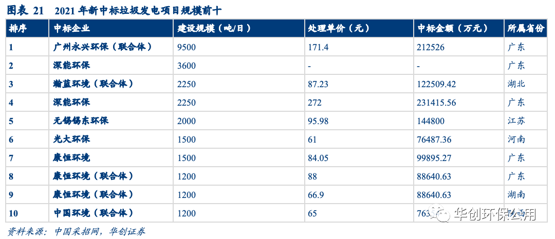 產(chǎn)能視角:行業(yè)步入成熟期,馬太效應(yīng)明顯。據(jù)不完全統(tǒng)計,2022年1-4月垃圾焚燒新中標項目數(shù)量較去年同期有所提升,但訂單的釋放省份多數(shù)位于中部地區(qū),日處理量超過1000噸僅3個,故新增產(chǎn)能和投資額同比分別下滑;后補貼時代,新中標的垃圾焚燒發(fā)電項目噸垃圾處置費上浮明顯,較2021年平均79.72元/噸增長20.21%。高質(zhì)量項目中標企業(yè)以頭部公司為主,鮮有小公司的身影出現(xiàn),行業(yè)馬太效應(yīng)繼續(xù)增強。