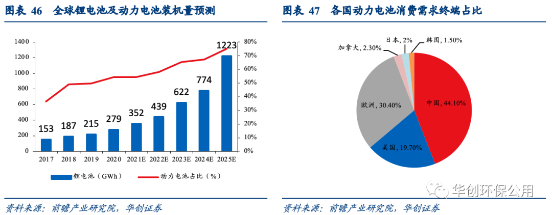 在電動汽車市場快速增長帶動下,動力型鋰離子電池繼續(xù)保持快速增長勢頭。全球動力電池年新增裝機量保持快速增長,根據(jù)前瞻產(chǎn)業(yè)研究院的預(yù)測,2025年全球鋰電池裝機量將會達到1223GWh,動力電池占比高達75.2%。2020年中國動力電池終端消費需求高達44.1%,居世界第一位。硫酸鈷和硫酸鎳是生產(chǎn)三元動力電池的重要材料,未來有望量價齊升。
