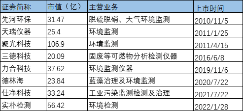 其中主要涉及環(huán)境監(jiān)測檢測業(yè)務的企業(yè)有8家,平均發(fā)行市盈率約為43.4,整體上高于固廢企業(yè)和水務企業(yè)。2019年之后上市企業(yè)4家,平均發(fā)行市盈率為26.3。