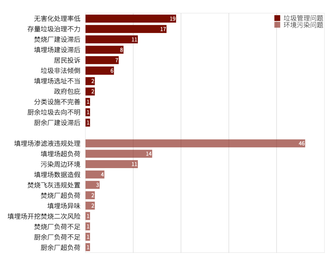 在垃圾管理問題中,無害化處理率低、存量垃圾治理不力、焚燒廠建設滯后、填埋場建設滯后等問題表現(xiàn)突出。