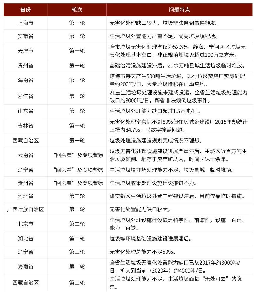 個別省區(qū)市歷史上無害化處理率低、無害化處理能力不足問題嚴重。其中,山東省在第一輪例行督察中被中央環(huán)保督察組反饋“生活垃圾處理能力缺口超過1.5萬噸/日”、云南省在“回頭看”及專項督察中被反饋“垃圾無害化處理設施建設進展嚴重滯后,主城區(qū)近百萬噸生活垃圾傾倒、堆存于廢棄礦坑內(nèi),時間長達十余年”、北京市第二輪例行督察被反饋“生活垃圾處理設施建設缺乏科學性、前瞻性,設施一直建、能力一直缺”等。具體情況詳見表1。