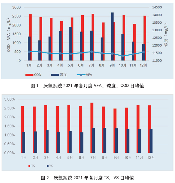 廣州福山生物質(zhì)綜合處理廠厭氧系統(tǒng)2021年運(yùn)行狀況見圖1、圖2。