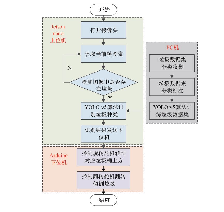 上位機識別程序利用YOLO v5模型進行垃圾分類識別,采用Jetson Nano作為上位機來運行程序,識別完成后將識別結(jié)果通過串口發(fā)送給下位機Arduino ,并進行相關(guān)動作。由于垃圾箱內(nèi)識別區(qū)是相對封閉穩(wěn)定的區(qū)域,光照基本不變、識別背景穩(wěn)定,給高精度識別帶來了便利。