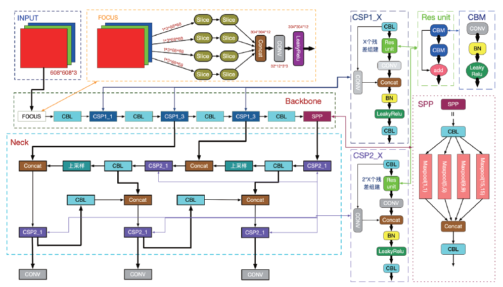 2 ) Blackbone 網(wǎng)絡:以Focus 結(jié)構(gòu)作為基準網(wǎng)絡,原始圖像輸人到Focus結(jié)構(gòu)中,使用32個卷積核進行切片操作,最終將其變成304×304×32的特征圖,其中應用了CSP1__X 結(jié)構(gòu)。