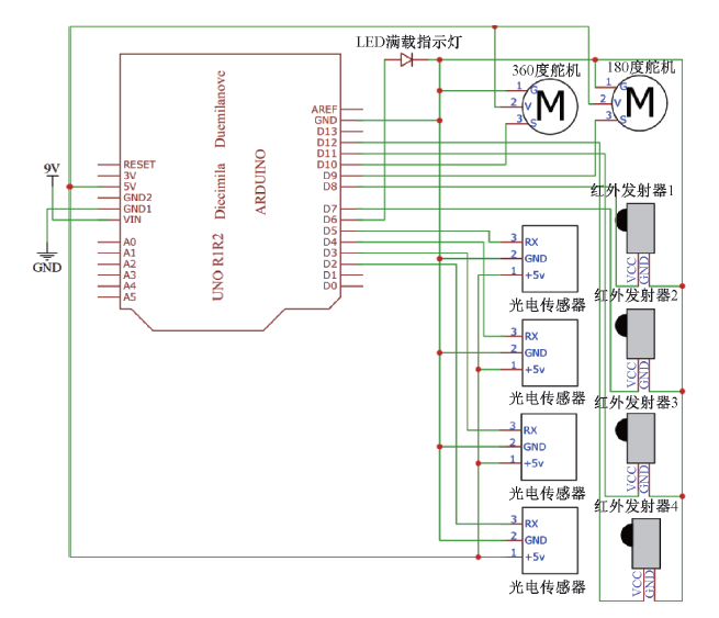 下位機硬件電路設計如圖4所示,Arduino 工作電壓一般為3~5 V,符合Led指示燈和4個紅外發(fā)射器的電壓要求,故可直接將該5個器件連接在引腳與CND之間,實現(xiàn)開關(guān)控制。LED正極連接Arduino 6號引腳,紅外發(fā)射器1、2、3、4的正極分別連接Arduino的 11、12、8、7號引腳。同理,2個舵機通過Arduino的+5V和 GND形成回路進行供電。2個舵機均通過PWM信號控制,對應Arduino 10號引腳和9號引腳,通過不同的占空比轉(zhuǎn)動對應的角度,實現(xiàn)了云臺及翻斗的精準控制。4個光電傳感器供電原理同上,RX引腳分別連接Arduino 的5、4、3、2引腳,同時將Arduino 上的這4個引腳定義為輸入模式,實時檢測垃圾桶的裝載狀態(tài)。