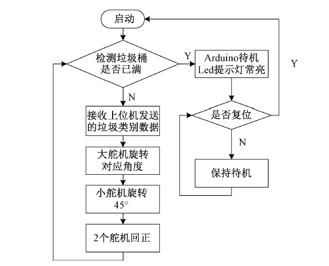下位機軟件工作流程如圖5所示。首先啟動Arduino,通過光電傳感器與紅外發(fā)射器模塊判斷垃圾桶是否已滿。若垃圾桶已滿,向上位機發(fā)送已滿信號、點亮Led燈同時進入待機狀態(tài)。若垃圾桶未滿,則Arduino接收上位機信號,信號0、1、2、3分別對應廚余垃圾、可回收垃圾、有害垃圾、其他垃圾,Arduino與上位機Jetson Nano 之間的通信通過ASCII碼傳輸,對應接收到的值為48、49、50、51 ,通過對這4個值的判斷,來控制舵機模塊準確將垃圾投進對應的垃圾箱。大舵機對應不同種類垃圾,0號垃圾桶逆時針旋轉(zhuǎn)45°,1號垃圾桶順時針旋轉(zhuǎn)45°,2號垃圾桶順時針旋轉(zhuǎn)135°,3號垃圾桶逆時針旋轉(zhuǎn)135°,從而將云臺對準相應的垃圾桶,之后小舵機旋轉(zhuǎn)30°將翻斗抬起,將垃圾準確迅速地投入垃圾桶。2個動作完成后,2個舵機分別回到初始0°狀態(tài)。投放完畢后﹐翻斗、云臺分別回正,同時檢測垃圾桶是否已滿,并重復上述步驟。