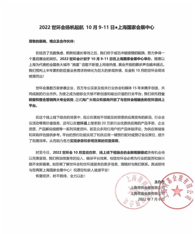 時(shí)至今日,2022世環(huán)會(huì)10月重啟在即,線上線下相融合的全新觀展模式終有機(jī)會(huì)得以呈現(xiàn),我們將加倍宣傳的投入,確保平臺(tái)效果,相信世環(huán)會(huì)必將為行業(yè)的復(fù)蘇和振興翻開全新篇章。如您需了解世環(huán)會(huì)和世環(huán)通服務(wù)的更多信息,請隨時(shí)與我們聯(lián)系。真誠期待與您再聚上海國家會(huì)展中心!祝愿您和家人健康平安!