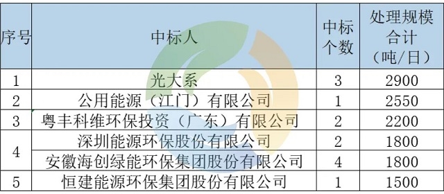 從中標(biāo)企業(yè)上看,26個項目共計17個企業(yè)/集團中標(biāo)。按處理規(guī)模統(tǒng)計,前五名企業(yè)排名如下(注:深能環(huán)保和海創(chuàng)綠能并列第四):