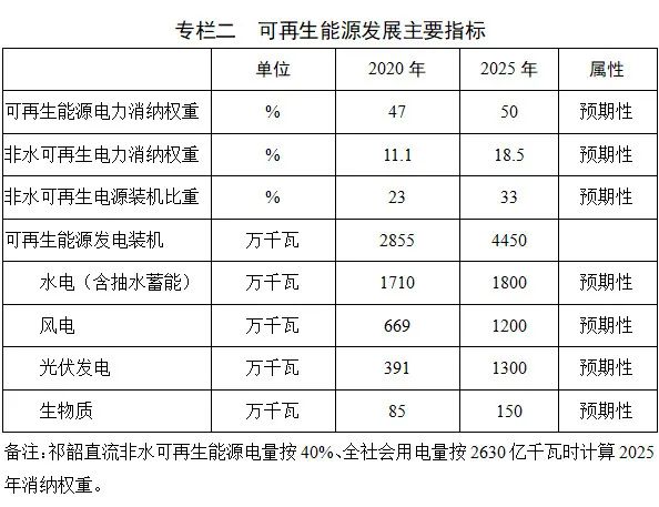 對(duì)標(biāo)國(guó)家總體目標(biāo),結(jié)合我省實(shí)際,在“十四五”期間努力實(shí)現(xiàn)可再生能源“綠色貢獻(xiàn)更大、利用領(lǐng)域更廣、使用成本更低、產(chǎn)業(yè)結(jié)構(gòu)更優(yōu)”的發(fā)展目標(biāo)。到2025年,可再生能源發(fā)電裝機(jī)規(guī)模達(dá)到約4450萬(wàn)千瓦,其中水電1800萬(wàn)千瓦,非水可再生能源2650萬(wàn)千瓦,全省可再生能源電力消納責(zé)任權(quán)重穩(wěn)定在50%左右,非水可再生能源電力消納責(zé)任權(quán)重達(dá)到18.5%左右,非化石能源消費(fèi)占一次能源消費(fèi)總量的22%以上。