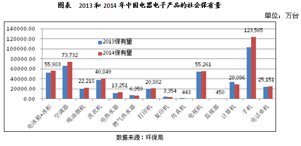 廢棄電器電子產(chǎn)品理論報(bào)廢量的測(cè)算為行業(yè)管理提供重要的依據(jù)。根據(jù)國家統(tǒng)計(jì)年鑒電器電子產(chǎn)品居民百戶擁有量與居民戶數(shù)測(cè)算的居民保有量見下圖。除固定電話和黑白電視機(jī)之外,其他產(chǎn)品均逐年增長,其中移動(dòng)電話的增長速度最高。中投顧問發(fā)布的《2017-2021年中國電子廢棄物處理行業(yè)深度調(diào)研及投資前景預(yù)測(cè)報(bào)告》指出,2013和2014年中國電器電子產(chǎn)品的社會(huì)保有量持續(xù)上升,社會(huì)保有量是根據(jù)電器電子產(chǎn)品銷量與對(duì)于該年報(bào)廢系數(shù)乘積的方法進(jìn)行的測(cè)算。