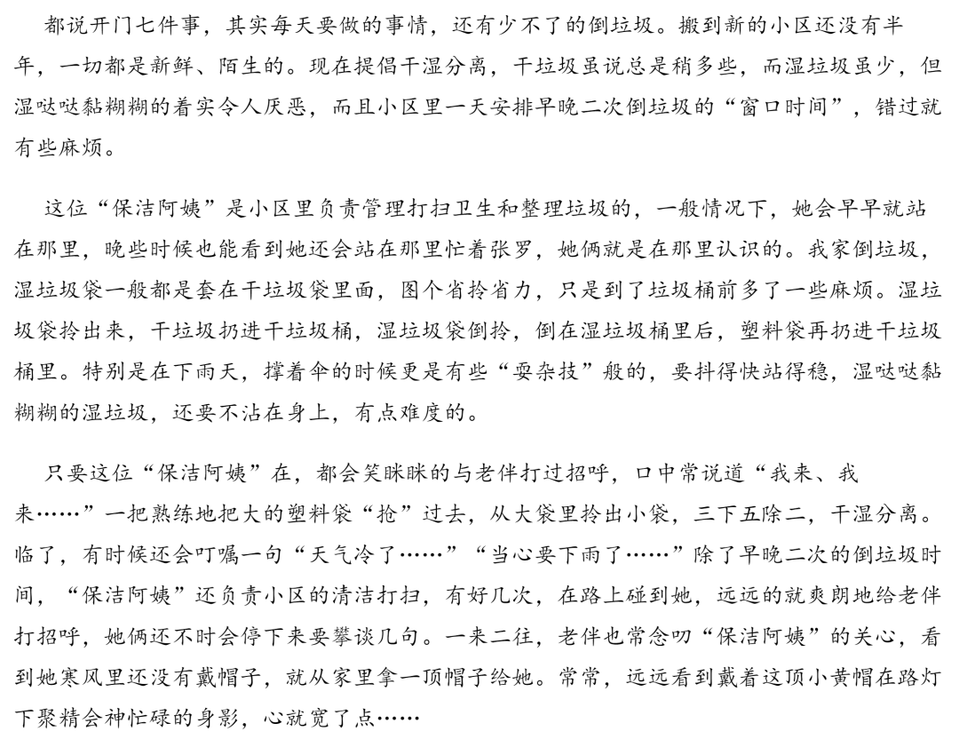 第三個(gè)付出,就是每天早晨七點(diǎn)到九點(diǎn),晚上六點(diǎn)到八點(diǎn)要去定時(shí)去丟垃圾,這個(gè)時(shí)間雷打不動(dòng)、刮風(fēng)下雨、過(guò)年過(guò)節(jié)、再忙再累,也都要去。很多時(shí)候都已經(jīng)到07:50了,才夫妻兩個(gè)人急急忙忙拎著4袋垃圾出門去丟,然后呢,還看到很多人和我們一起拎著垃圾袋沖向垃圾箱。這也是很重要的一個(gè)時(shí)間付出吧。