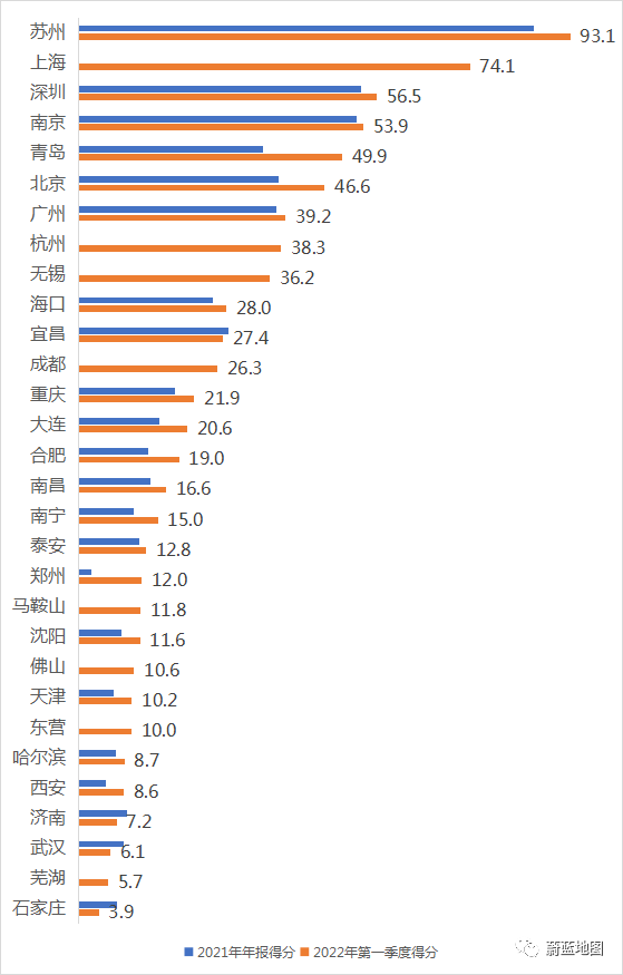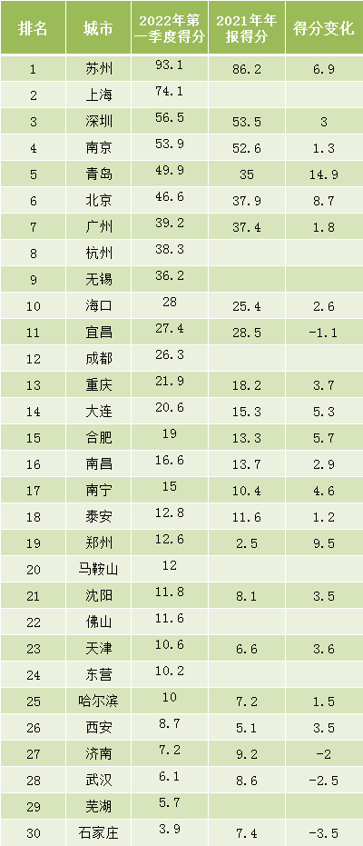 蘇州市百尺竿頭更進(jìn)一步,以93.1的高分繼續(xù)保持領(lǐng)先;本季度新納入評(píng)價(jià)的上海市74.1分,位居第二。哈爾濱、濟(jì)南、武漢、蕪湖、石家莊得分低于10分。