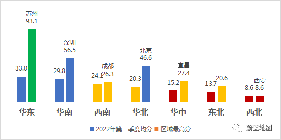 華東區(qū)、華南區(qū)因新加入的蕪湖、馬鞍山、東營、佛山得分較低,平均分略有下降,西南、華北、華中、東北和西北平均分均有所增長。圖 3 七大片區(qū)均分和區(qū)域最高分城市