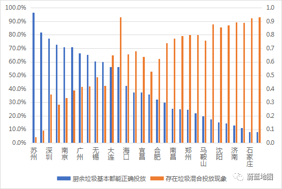 蘇州廚余垃圾正確投放率超過90.0%,武漢、石家莊隨手拍結(jié)果中顯示存在多種垃圾混合投放的比例超過90%。圖 4 30個(gè)城市觀查到廚余垃圾正確投放和混合投放隨手拍占比