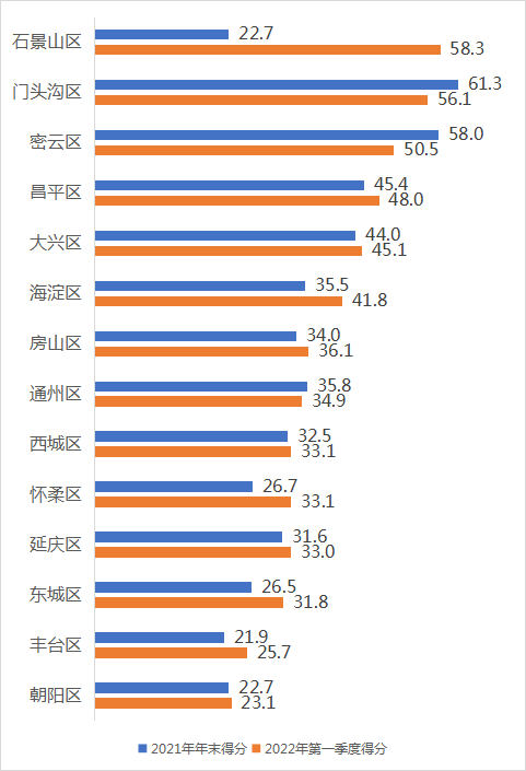 納入本期指數(shù)計(jì)算的北京市隨手拍共4235條,覆蓋十六個(gè)區(qū)3611個(gè)小區(qū),去除覆蓋度不足0.05%的順義區(qū)和平谷區(qū),十四區(qū)中得分最高的是石景山區(qū),58.3分,朝陽區(qū)最低,23.1分,全市各區(qū)平均分39.3.,城六區(qū)平均分35.6分。和2021年年末相比,各區(qū)平均分上升了3.7分,城六區(qū)平均分上升了8.7分。14個(gè)區(qū)的得分有所增長,其中石景山區(qū)增幅最大,得益于1月以來石景山區(qū)為迎接2022年冬奧會(huì)、冬殘奧會(huì),區(qū)城管委推進(jìn)的監(jiān)督管理智能化、推進(jìn)引導(dǎo)宣傳精細(xì)化、推進(jìn)社會(huì)參與常態(tài)化等舉措。圖 21 北京市11區(qū)2022年第一季度垃圾分類指數(shù)得分