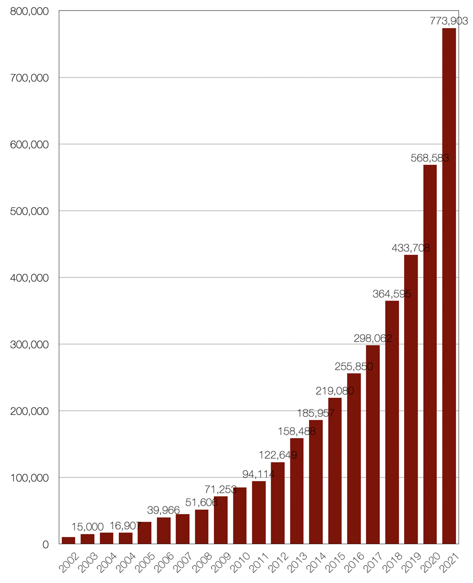 圖3.我國(guó)生活垃圾焚燒處理能力的增長(zhǎng)情況(2002-2021)