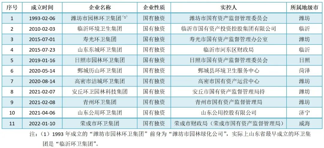 山東省共有16個(gè)地級(jí)市,企查查數(shù)據(jù)顯示,所有地級(jí)市均有國(guó)企涉足環(huán)衛(wèi)領(lǐng)域,但以“環(huán)衛(wèi)集團(tuán)”命名,具備一定規(guī)模和知名度,且以本地環(huán)衛(wèi)作業(yè)單位為基礎(chǔ)改制而來(lái)的環(huán)衛(wèi)企業(yè)則只有11家。如表2所示。