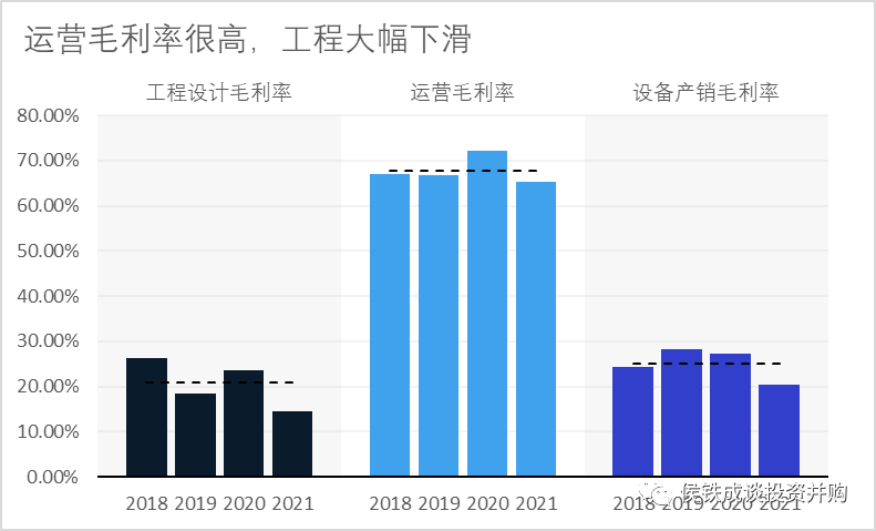 新業(yè)務(wù)中長(zhǎng)春的污泥項(xiàng)目在2020年報(bào)表有所體現(xiàn),收入1個(gè)億,利潤(rùn)近5000萬,形勢(shì)大好。然而公司在2021年年報(bào)中,污泥收入下降,毛利率由原來的51%下降到29%了。應(yīng)該是遠(yuǎn)沒有達(dá)到預(yù)期。實(shí)際上運(yùn)營板塊的毛利降低,很可能是污泥運(yùn)營業(yè)務(wù)拖累的。