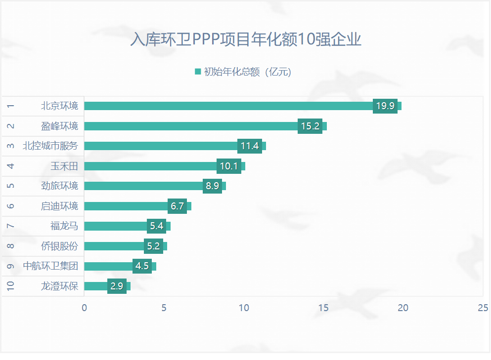 在337個(gè)已開(kāi)標(biāo)環(huán)衛(wèi)PPP項(xiàng)目中,北京環(huán)境已中標(biāo)環(huán)衛(wèi)PPP項(xiàng)目年化總額超過(guò)22億元(按初始年化額計(jì)算),排名第一,占全部已開(kāi)標(biāo)環(huán)衛(wèi)PPP項(xiàng)目年化總額的13%。