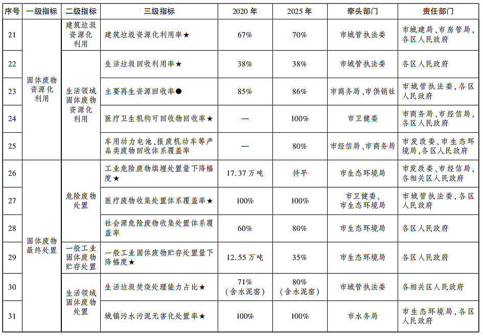 “無廢城市”是以創(chuàng)新、協(xié)調(diào)、綠色、開放、共享的新發(fā)展理念為引領(lǐng),通過推動形成綠色發(fā)展方式和生活方式,強(qiáng)化固體廢物源頭減量,提升廢棄物資源綜合循環(huán)利用水平,有效保障無害化處置能力,最大限度降低固體廢物填埋量,是一種先進(jìn)的城市管理理念。具體建設(shè)目標(biāo)是:到2025年,全市工業(yè)固體廢物產(chǎn)生強(qiáng)度較快下降,主要農(nóng)業(yè)廢棄物接近全量利用,生活垃圾分類基本實現(xiàn)全覆蓋,建筑垃圾綜合利用水平顯著提升,危險廢物得到安全管控,固體廢物管理信息“一張網(wǎng)”初步建成,以汽車、鋼鐵、石化、建材、食品等為主導(dǎo)的產(chǎn)業(yè)“無廢”模式初步形成,“無廢”理念深入人心。