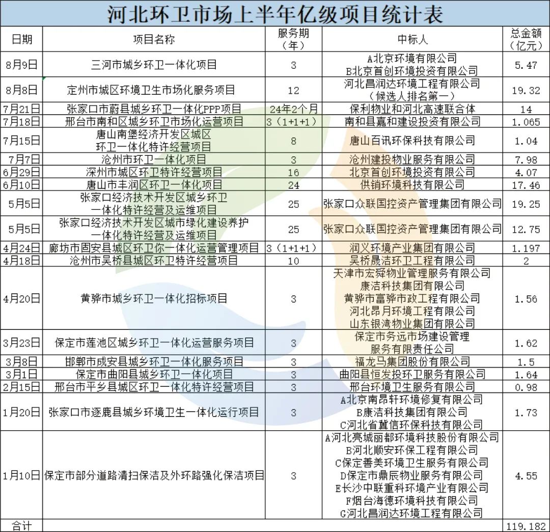 8月8日,超19億元的定州市城區(qū)環(huán)境衛(wèi)生市場(chǎng)化服務(wù)項(xiàng)目公布中標(biāo)候選人公示,河北昌潤(rùn)達(dá)環(huán)境工程有限公司排名第一;8月9日,約5.5億元三河市城鄉(xiāng)環(huán)衛(wèi)一體化項(xiàng)目又被北京環(huán)境有限公司和北京首創(chuàng)環(huán)境投資有限公司攜手?jǐn)孬@。至此,河北省今年已開標(biāo)的億級(jí)環(huán)衛(wèi)項(xiàng)目總金額已超119億元,加上在招標(biāo)項(xiàng)目,河北省今年環(huán)衛(wèi)項(xiàng)目的釋放量已超130億元!不僅如此,進(jìn)入2022年之后,河北省在生活垃圾末端處置方面的發(fā)展也較為迅速,主要體現(xiàn)在生活垃圾焚燒項(xiàng)目、建筑垃圾資源化利用項(xiàng)目等方面。而這一切的“大爆發(fā)”,和地方“十四五”時(shí)期各項(xiàng)規(guī)劃及相關(guān)政策有密切聯(lián)系。可以大膽地預(yù)測(cè),未來5年,河北將是環(huán)衛(wèi)企業(yè)競(jìng)相爭(zhēng)奪的“圣地”。項(xiàng)目釋放量突破130億,國(guó)資控股企業(yè)大放異彩
