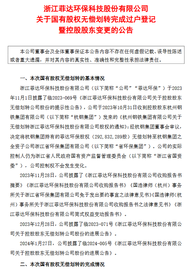 菲達(dá)環(huán)保發(fā)布公告稱,2024年2月8日收到中國(guó)證券登記結(jié)算有限責(zé)任公司出具的《過(guò)戶登記確認(rèn)書(shū)》,確認(rèn)本次無(wú)償劃轉(zhuǎn)的股份過(guò)戶登記手續(xù)已辦理完畢。