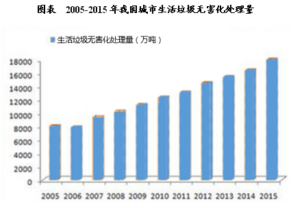 2005-2015年間,我國城市生活垃圾無害化處理量年均復(fù)合增長率(CAGR)為8.38%。