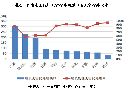 但個別地區(qū)生活垃圾無害化處理仍有缺口,主要是一些垃圾產(chǎn)生量基數(shù)較大的省份,如廣東省雖然無害化處理率已經(jīng)達(dá)到86%,但缺口仍有300萬噸,以及垃圾處理發(fā)展較為緩慢的地區(qū),如黑龍江、吉林和甘肅三省無害化處理率都在60%左右,尚有較大的增長空間。因此雖然垃圾的無害化處理在全國整體已接近飽和,但部分地區(qū)仍有快速擴(kuò)張的機(jī)會。