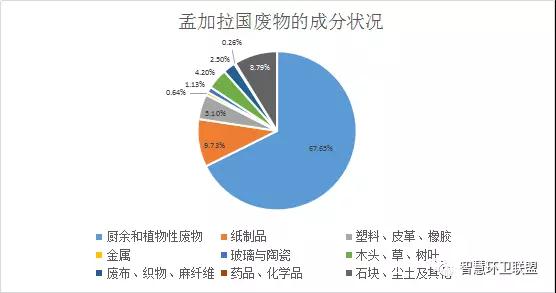 從圖表中可以看出,在孟加拉國(guó)的廢物中,有機(jī)成分占了很大的比例,超過(guò)了70%,導(dǎo)致廢物不僅含水量很高(超過(guò)50%),熱值也很低(小于1000千卡/千克)。