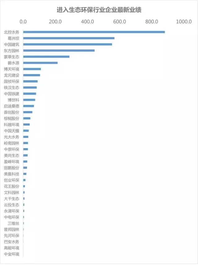 截至2017年10月31日, 36家企業(yè)在生態(tài)環(huán)保領(lǐng)域總中標(biāo)金額達(dá)到4010.3億元,項目數(shù)量達(dá)268個。國企中生態(tài)環(huán)保領(lǐng)域業(yè)績最好的是北控水務(wù),總投資額達(dá)882億元,民企中業(yè)績最好的是東方園林,總投資額達(dá)444.5億元。
