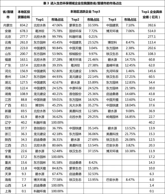 在各省/直轄市生態(tài)環(huán)保行業(yè)細(xì)分領(lǐng)域Top3的省份詳情見表4。