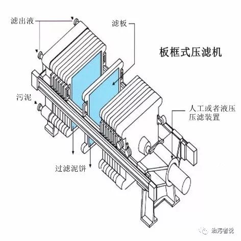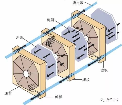 從壓濾機的示意圖可以看到,板框式壓濾機是由一張張濾板疊加而成的,濾板之間是有空間的,污泥注入這個濾板之間后,通過人工或者液壓的壓濾裝置,把污泥中的水分擠壓出去,形成泥餅,擠壓出來的過濾液通過濾板上設置的濾出液管流出板框壓濾機外。