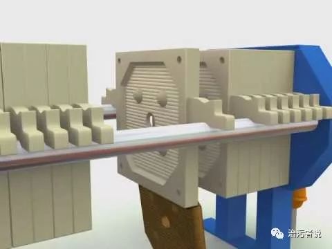 上圖可以看到濾布,濾板,泥餅,濾出液之間的關系??梢钥吹桨蹇蚴綁簽V機更像一臺不會轉動的濾帶壓濾機,通過固定在濾板上的濾布一次次擠壓,完成了污泥脫水的過程。