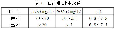 根據(jù)實驗室小試結(jié)果,原設(shè)計的CASS池運行周期是4h,其中曝氣2h,沉淀1h,排水1h。調(diào)試過程中發(fā)現(xiàn)原水濃度比設(shè)計參數(shù)偏低,有必要根據(jù)實際廢水情況來確定運行周期,根據(jù)進、出水水質(zhì)指標(biāo)調(diào)整周期中各階段時間的分配。實際運行周期仍為4h,其中曝氣115h,沉淀1h,排水1h,時延015h,這樣在保證出水水質(zhì)的情況下節(jié)省了能耗。