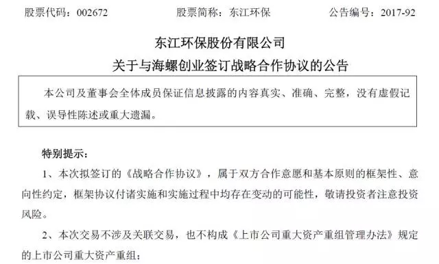 12月4日下午,東江環(huán)保發(fā)布公告稱,公司擬與中國海螺創(chuàng)業(yè)控股有限公司(下簡稱“海螺創(chuàng)業(yè)”)于2017年12月6日簽署《戰(zhàn)略合作協(xié)議》,就水泥窯協(xié)同處置固廢事宜達成戰(zhàn)略合作意向。預計雙方將在固廢處理領域?qū)崿F(xiàn)強強聯(lián)合、優(yōu)勢互補,共同推進危廢處理行業(yè)的健康發(fā)展。